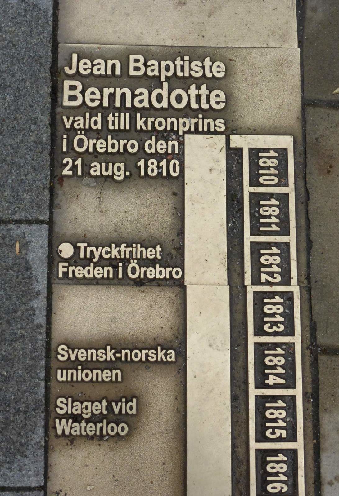 La ville de Örebro offre aux passants, en face du château et au pied de la statue de Bernadotte, une ligne de pierre et de bronze d'une longueur de 15 m qui indique les dates principales de l'histoire de la ville, de la Suède et du monde, entre 1810 et 2010. Pourquoi ces deux dates ?