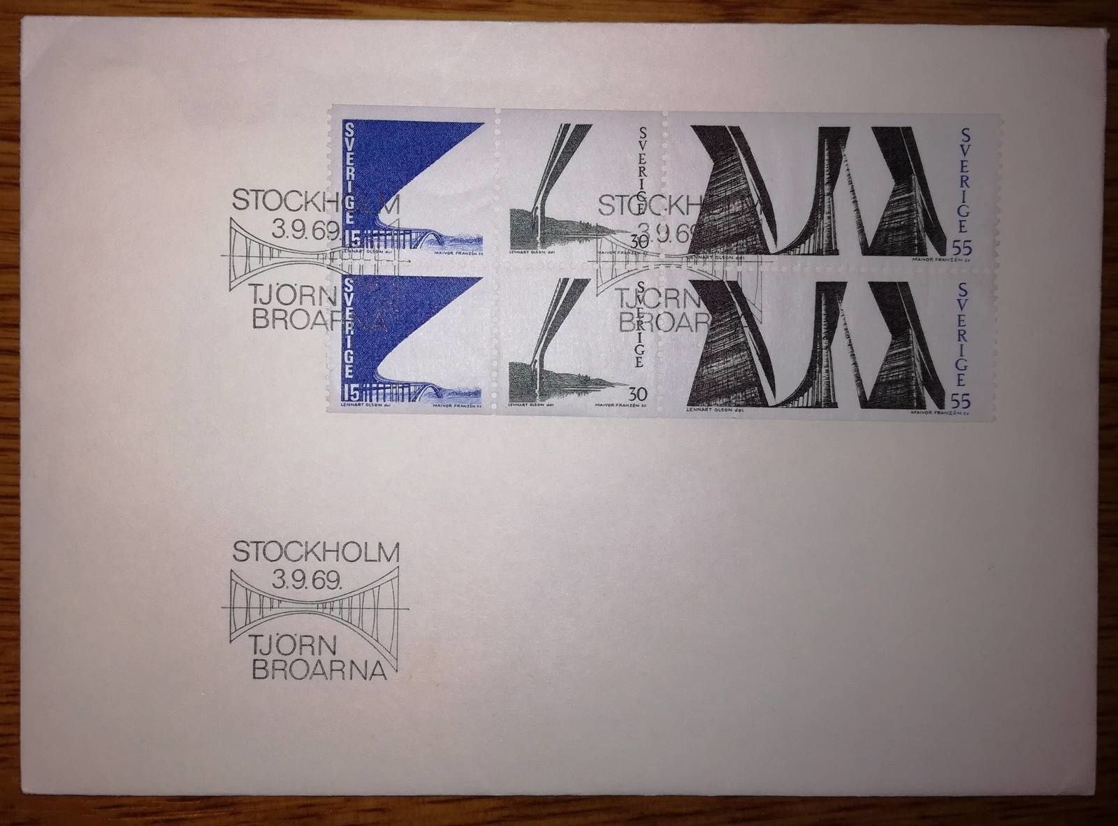 Une Enveloppe Premier Jour de 1969 présente des timbres figurant les ponts qui relient l'Île de Tjörn et les îles annexes au continent. La succession de ces trois ponts a été inaugurée en 1960. Cette enveloppe est la première de la série que j'ai achetée à présenter un livret rédigé dans 4 langues, dont le français : la photo de cette page me dispensera donc de toute autre explication.