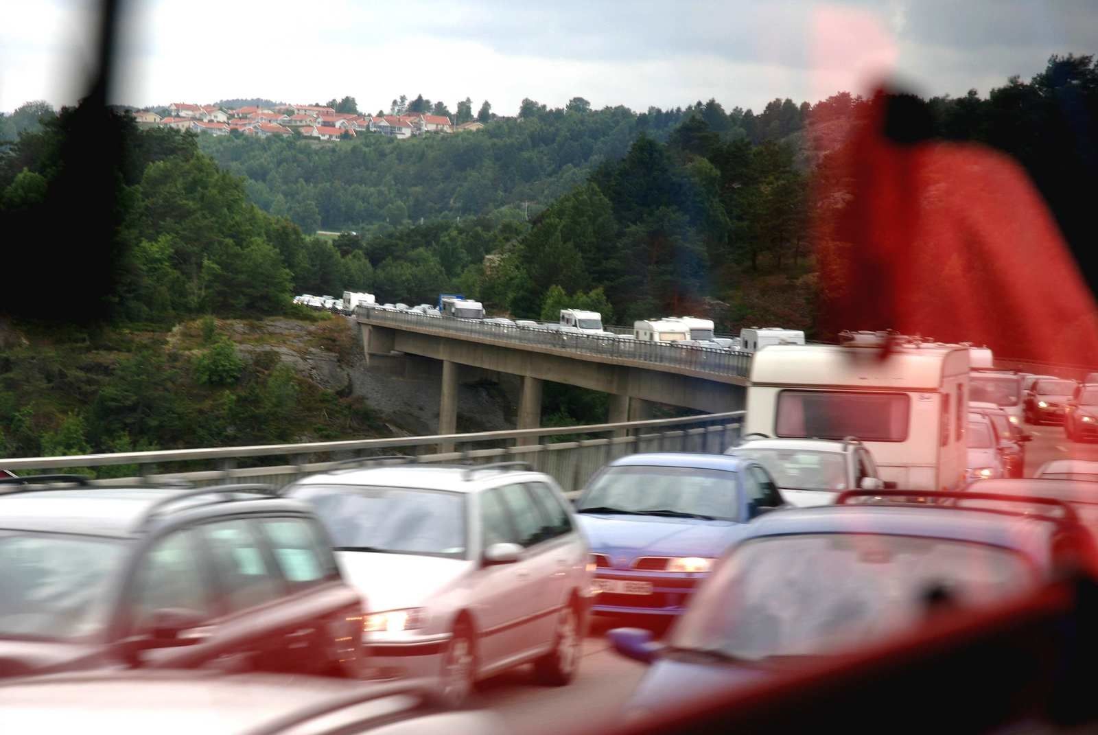 J'ai franchi ces ponts à deux reprises en 2012, pour me rendre sur l'île de Tjörn et pour en revenir. J'ai même logé dans un endroit huppé au pied du premier, comme je l'explique dans un autre article. La première photo est prise à l'aller depuis l'autocar, la route est totalement investie, dans le sens du retour, par les Suédois qui viennent de passer le week-end de la Midsommar sur l'île et qui rentrent chez eux, à Göteborg par exemple. Ces ouvrages étaient donc bien nécessaires !