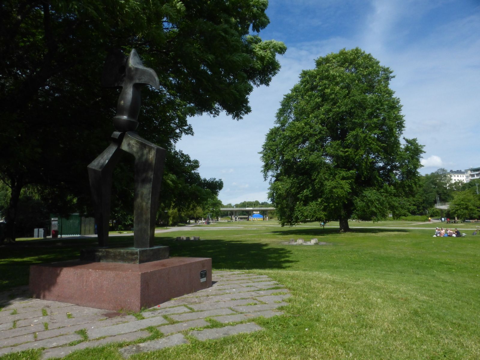 Je n'étais encore jamais allé au Rålambshovsparken situé tout près du centre de Stockholm et que j'aurais aussi pu atteindre à pied en passant devant l'Hôtel de Ville. Le sud de ce parc donne sur le lac et s'étend bien plus au nord. Il est fréquenté par des promeneurs, des groupes qui font de la remise en forme et des adeptes du skate-parc, que l'on devine au fond de la seconde image, sous le pont. Entre autres ! Curieusement, je n'ai vu en Suède que des gens qui pratiquent les modules avec leur trottinette, et jamais de roller inline et encore moins de quad, ni à Stockholm, ni dans les autres villes bien plus petites que j'ai visitées.